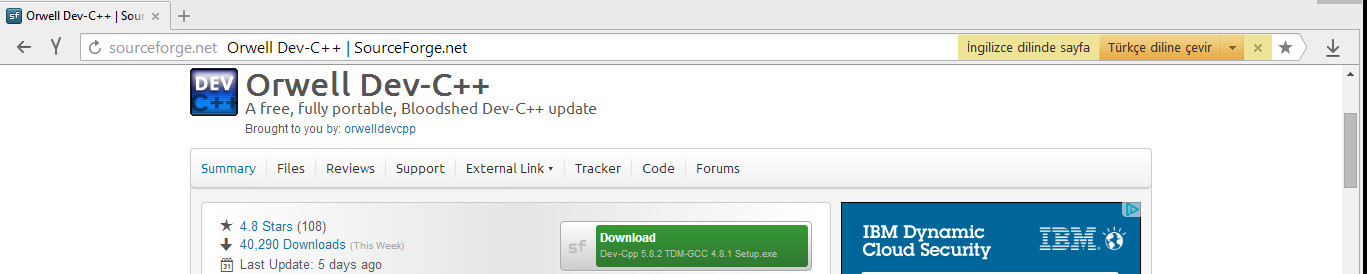 Öncelikle kurulum dosyası indirmek üzere sourceforge.net/projects/orwelldevcpp/ adresine girelim ve resimde işaretlenen Downland butonuna tıklayalım. Gelen sayfaya 5 saniye içinde indirme işlemi otomatikman başlatılacaktır.