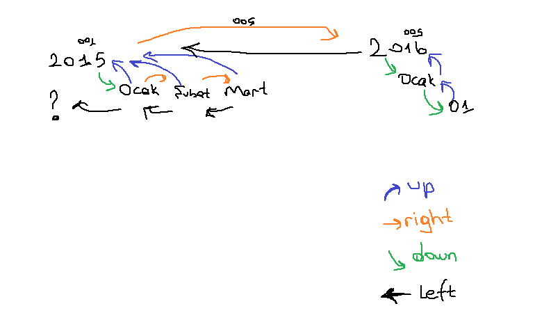 left, right, up, down değerleri bir düğümün (node) diğer düğümlere göre konumunu gösterir. Soru işareti ile gösterilen ocaktan önce bir eleman olmadığı için o kökte başa gelmiş olunuyor.